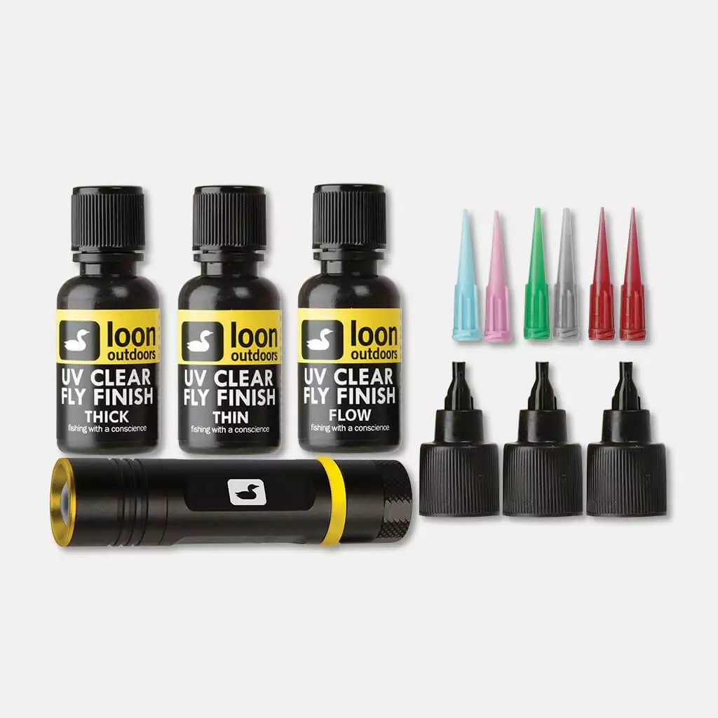 With everything a tyer needs to make the move from traditional cements to UV Cure, the UV Fly Tying Kit includes UV Clear Fly Finish Thick, Thin and the brand new, ultra-thin Flow, and a UV Bench Light.