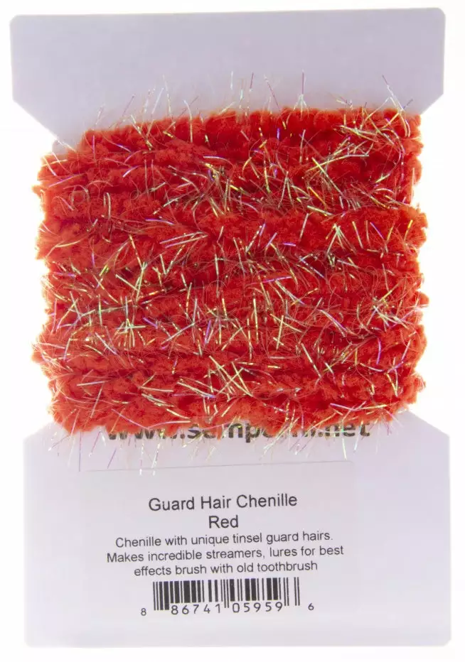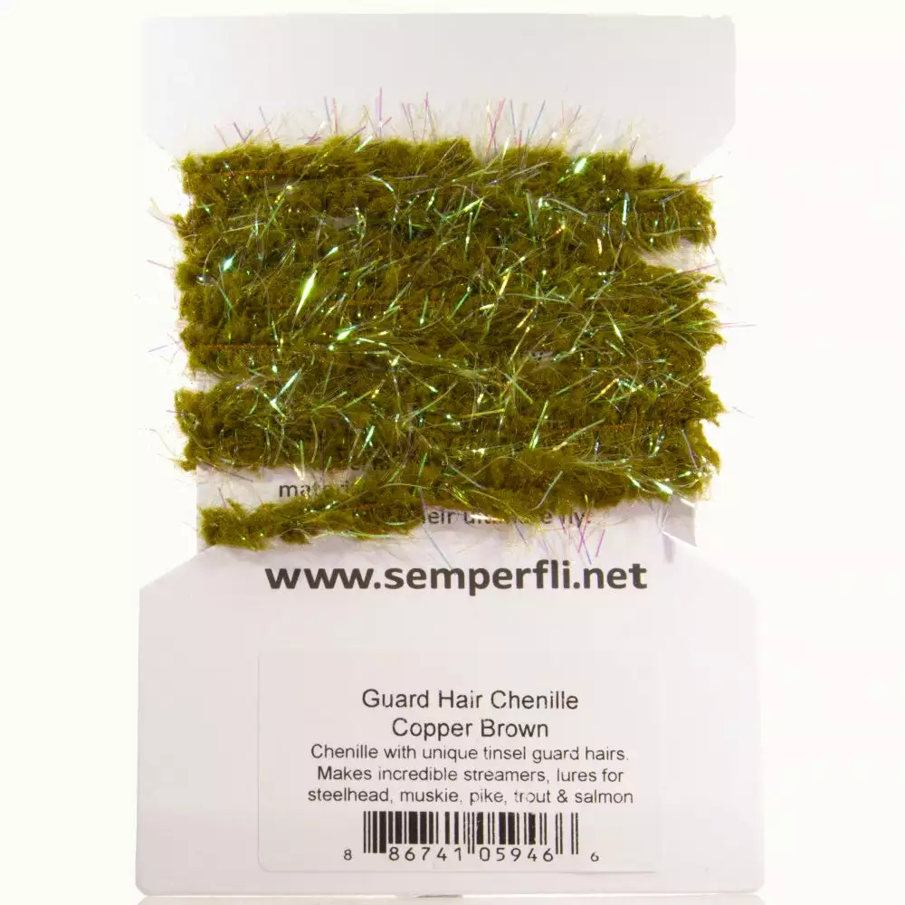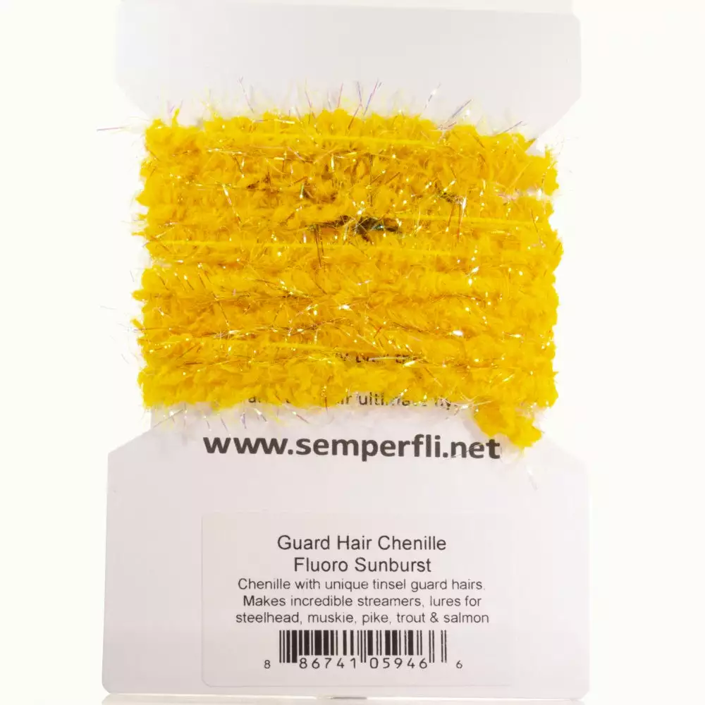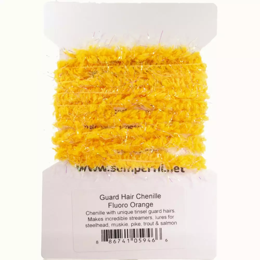 Guard Hair Chenille imitates animal fur with guard hairs for fishing flies. When you look at animal fur we see protruding guard hairs which are loved by fly tyers. These add body and give movement to flies. Guard Hair Chenille was designed to imitate the natural fur of animals using gold tinsel that protrudes above the chenille. Guard Hair Chenille is ideal for streamers, saltwater and predator patterns where the gold guard hairs provide movement and create stunning fly patterns. Try on buggers and humungous for larger mobile bodies.