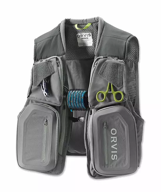 The PRO Vest is designed to carry everything you need, but is very light and breathes well for comfort. It is built of light, abrasion-resistant nylon with a DWR coating. The fitted design is built to conform to the body. The shoulders have a lofted spacer mesh of nylon and spandex. There are 18 pockets—10 exterior, 6 interior, and 2 rear ergonomically designed with new materials to provide organization coupled with smooth workflow on the water. The two lower main pockets offer compression-molded construction that add rigidity. The upper pockets are medium size, both with Orvis custom hideaway tool port underneath two fly-drying patches. The rear pockets offer a large pass-through game-style pocket under a full-zip rear pocket with mesh panel divider. Other features include multiple daisy chain gear loops, elastic loops to attach tippet bars, an adjustable closure that slides vertically for a custom fit, padded collar for comfort, internal webbing hanging loop, and a tri-ring net holder centered on the rear yoke. Shell: nylon. Collar and lower pocket: nylon/spandex. Upper interior mesh: polyester. Lower interior mesh: nylon/spandex. Molded pocket base: compression-molded EVA. Washable. Imported.Shell: nylon. Collar and lower pocket: nylon/spandex. Upper interior mesh: polyester. Lower interior mesh: nylon/spandex. Molded pocket base: compression-molded EVA. Washable. Imported.