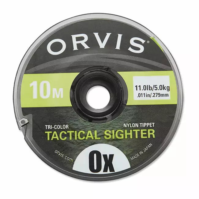 A .011 multicolor fly-fishing indicator tippet material that is equivalent to 0X. Chartreuse, orange, and white tricolor offers improved visibility. Excellent for use above clear tippet in a tight line nymphing rig. Material comes on a tippet spool with integrated cutter. Nylon. Imported.