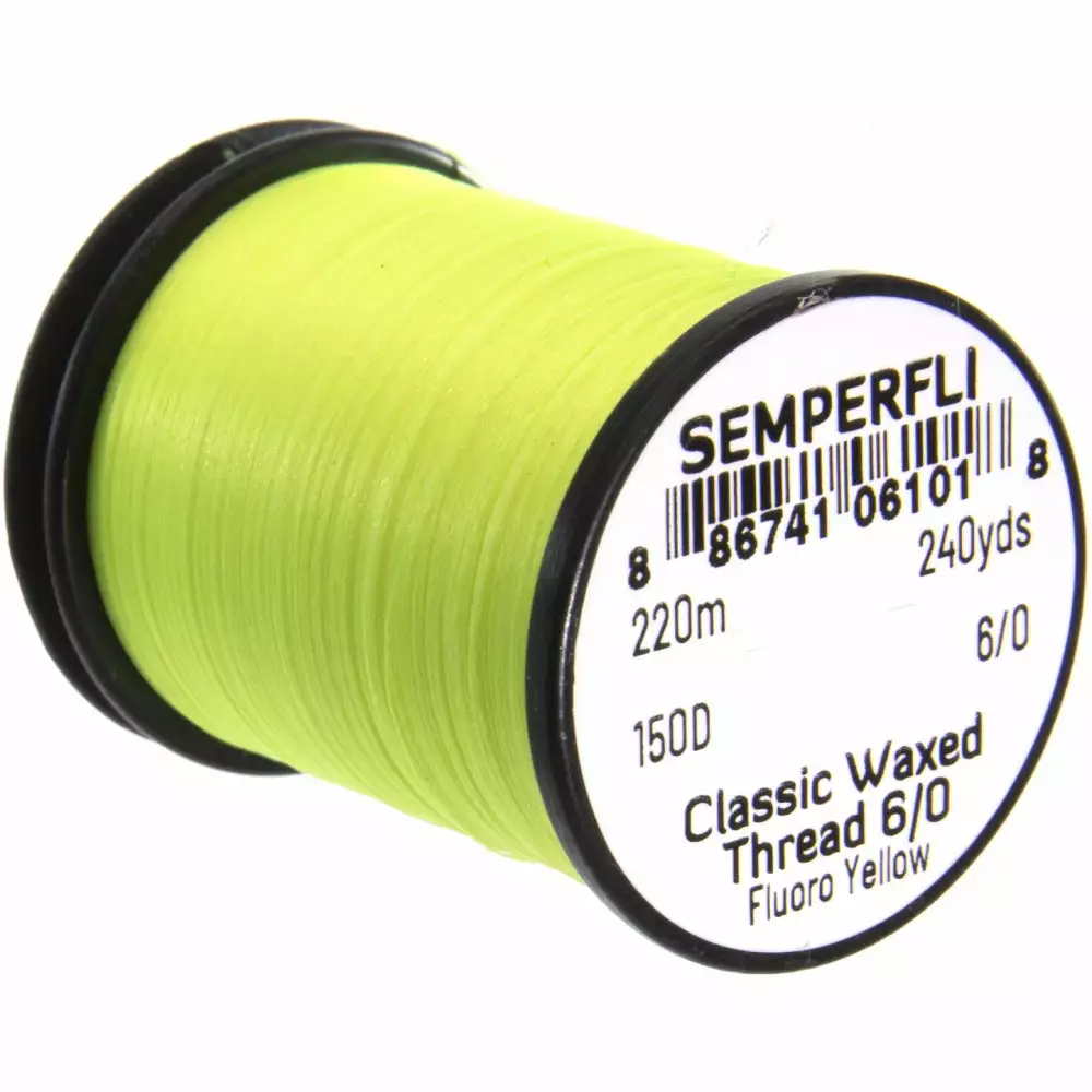 Classic Waxed Thread 6/0 240 Yards is part of the Semperfli 6/0 150 denier range of Classic Waxed Threads (CWT) which have been designed specifically for fly tying for large Salmon, Predator, Streamer flies and for deer hair spinning with its great strength and usually used on hook sizes 8 or larger. Classic Waxed Thread 6/0 240 Yards threads are unique; laying flat with a two core construction but can easily be split to create dubbing loops and they are strong threads. We worked with our Pro Team to get the correct amount of wax on each thread to hold materials but not clog your bobbin holder with Classic Waxed Thread 6/0 240 Yards . Having developed and manufactured our own computerised spooling machinery Classic Waxed Thread 6/0 240 Yards is put onto the spool with touching turns in totally level traverse, why is this important? With Classic Waxed Thread 6/0 240 Yards Chartreuse you will not get a birds nest when tying flies!