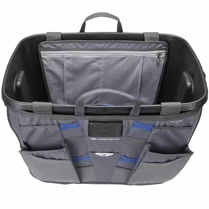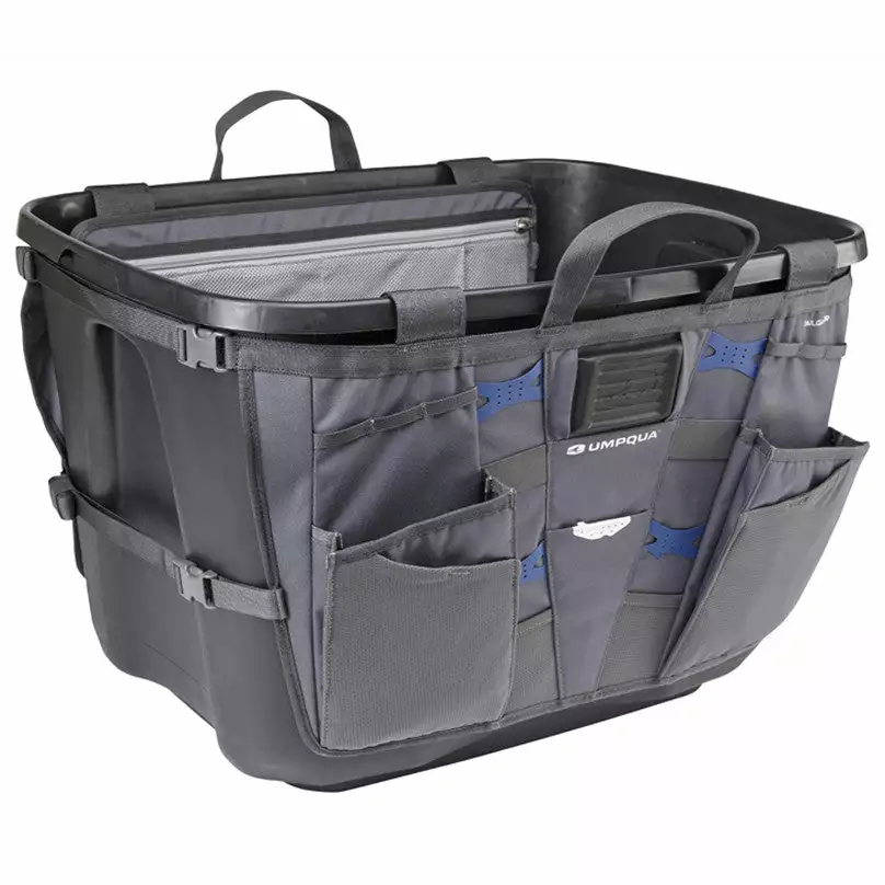 Inspired by our own Brian Schmidt who stores his boots and waders in a simple plastic tub/tote in the back of his car, the Tailgater ZS turns any plastic tub into the perfect fly-fishing base camp. Now, Brian’s plastic tub also stores fly boxes, reels/spools, gloves, socks, jacket, etc. It also functions as a prep station for rigging up with flies, hemostats, leaders, tippet, floatant, etc… adjustable to fit almost any size and style of plastic tub/tote. Two saddle-bag style organizers straddle the front and back walls of the tote and SR clip along the sides to secure. Each saddle-bag can also be used individually saddled over any rail or seat back.