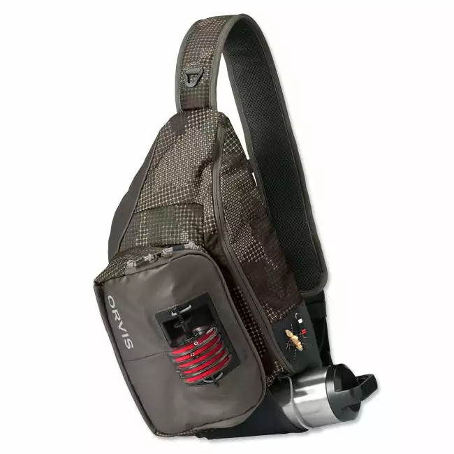 The best-selling Orvis fly-fishing Sling Pack has been updated and improved not only for durability, but with innovative new convenience features as well. The 100% recycled ECO CORDURA® platform is designed to store, organize, and offer easy, intuitive accessibility while staying completely out of your way when fishing. New features include the Tippet Whippet recessed docking station with tippet bar included for instant, fixed, and fumble-free access for up to six spools. Main compartment has zippered security pocket with key fob and stretch mesh pockets for small sort storage. Front drop-down has zippered pocket with elastic mesh slip pockets. Lo-pro zinger/nipper pass-through, easy swing handle, and water bottle holder with retainer. Front strap “dashboard” offers multiple docking stations for forceps and small tools as well as sliding adjustment for sternum strap. Left shoulder design frees up casting arm and shoulder. Weight: 500g/1.1 lbs. Shell: 100% recycled ECO CORDURA 600 denier polyester with strategic TPU coating. Liner: 100% recycled 200 denier polyester. Spot clean. Imported. Tippet and accessories not included.