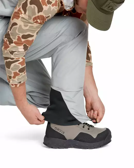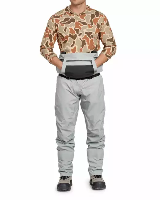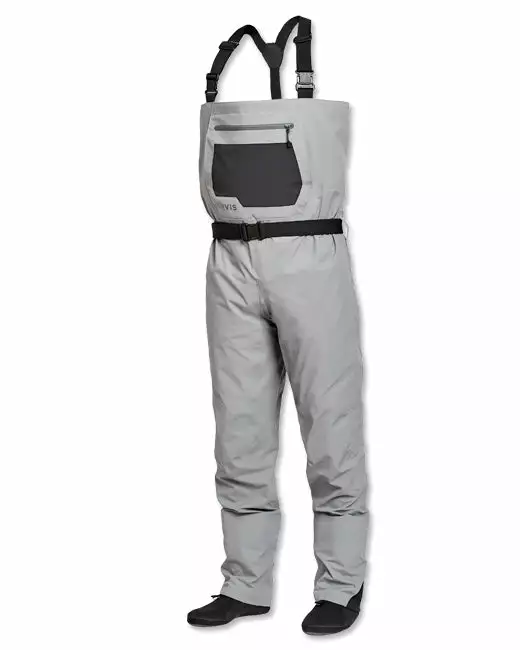 This new Clearwater fly-fishing wader for men is feature rich and built with a modern fit to eliminate traditional bulk. Four-layer waterproof breathable nylon fabric is light yet durable, with a 30K Waterproofness / 8K Breathability rating. Opposing side-release buckles allow for waist-high conversion on warm days. External storage pocket with stretch panel for small items and fly boxes, plus a kangaroo-style handwarmer pocket on the front chest. Updated anatomical neoprene booties with Integrated neoprene gravel guards to reduce water drag and collection. Low-profile seam construction and low-profile belt loops with 1½” webbing belt included. Hook and loop patch on interior pocket to attach Orvis waterproof pocket (8G3H sold separately). In stone. Nylon shell/ polyurethane membrane/Nylon tricot liner. Washable. Imported.