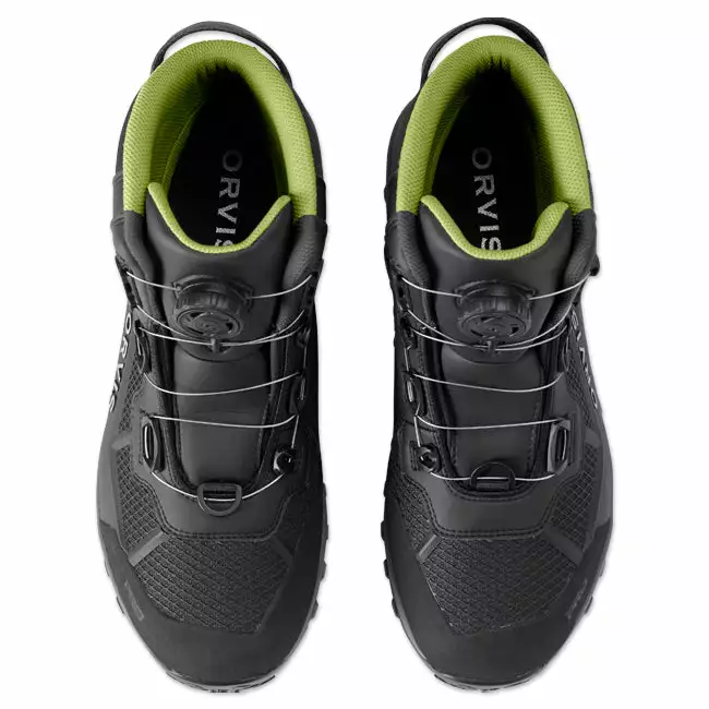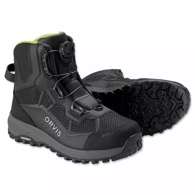 Experience easy on-and-off with instant lacing and more even tension and comfort throughout the Men’s PRO BOA Wading Boot. The addition of the BOA Lacing System to the PRO boot creates the most advanced wading boot in the industry with consistent tension throughout the boot for a better fit and enhanced all-day comfort. The PRO Wading Boot was an industry-first collaborative effort with Michelin®, built on an outsole compound specifically designed for fly fishing. This revolutionary new sole design is an industry-disrupting advance in wet rubber traction. The Michelin Outdoor Extreme outsole offers 25% better abrasion resistance and a resounding 43% improvement in wet rubber traction over the competition. Using Michelin tire geometry, it offers a wider footprint for stability, a higher ratio of surface contact, and a lug pattern that reduces shock and improves pressure distribution. The two-layer midsole has a co-molded ESS plate that provides improved stud retention and torsional stability. Orvis partnered with OrthoLite® to create a 3D molded X25 insole designed for high-impact sports, delivering maximum comfort and arch support. An industry-first cast PU upper eliminates seams while providing a zoned cage for added stability, grip, and extreme abrasion resistance without the added bulk. The boot is higher cut for ankle support and lined with closed-cell foam. Scratch rubber at the toe cap and heel for abrasion resistance, an oversized heel pull for easier on-and-off, and tightly woven laces reduce broken laces. In shadow. Weighs 50 oz. in size 10. Imported.